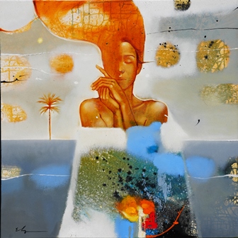 لوحاتها تمزج بين التكوينات التجريدية وصور النساء والأطفال، في صياغة بصرية تحمل طابعًا إنسانيًا وشاعريًا.
